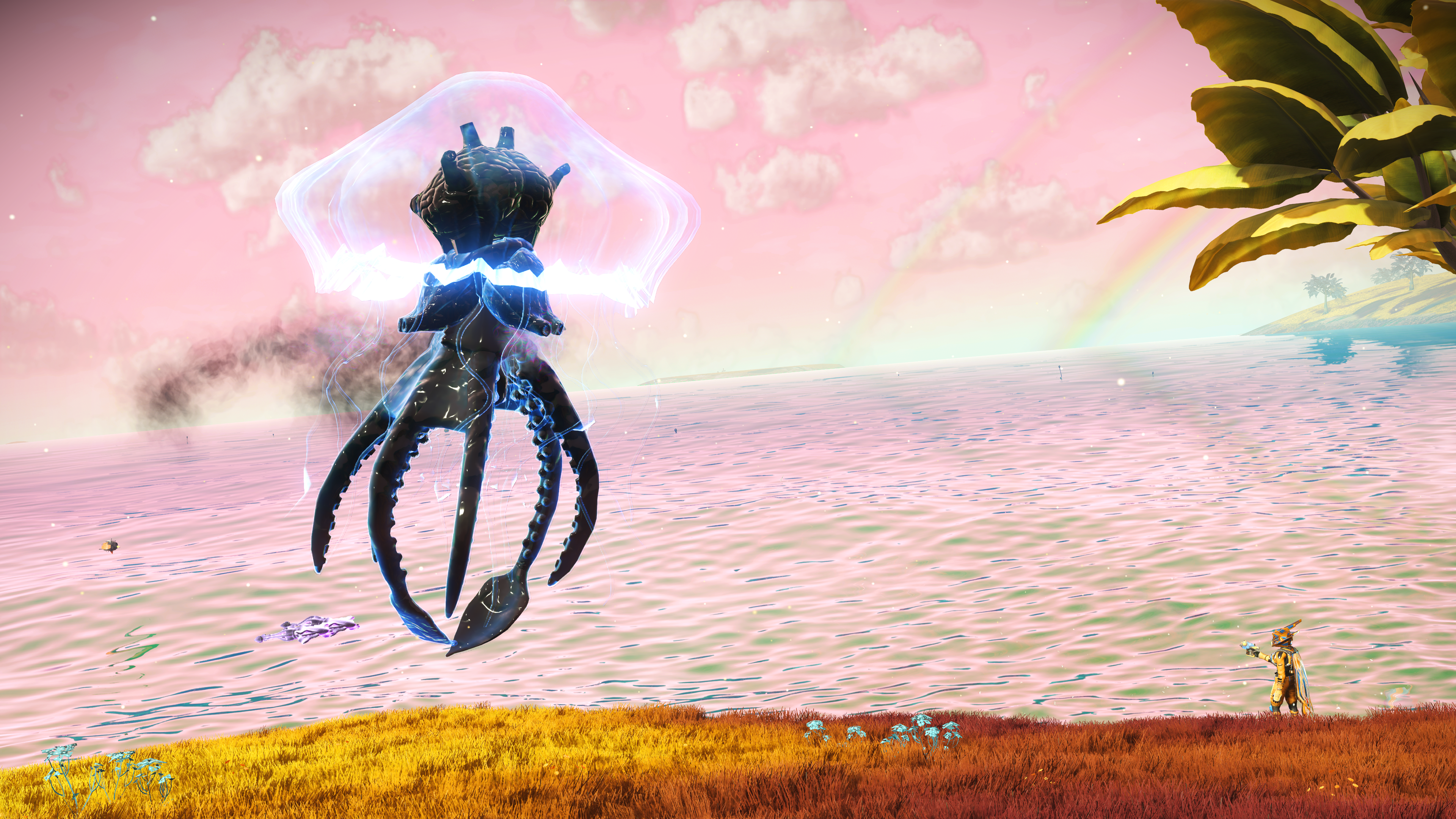 Otra parte interesante, han sido unos cuantos enfrentamientos. Una lucha con guardianes que se encuentran en los restos arqueológicos, recopilar unos ojos de piedra y que salieran a enfrentarse a ti. Los gusanos titánicos y sus larvas, es una genialidad encontrarse en mundos con estas criaturas. Y para terminar un último enfrentamiento con una medusa gigante, que forma parte del trasfondo de esta expedición.